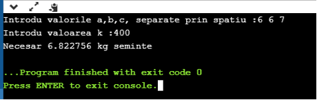 Задача: в городе Триунгены все газоны треугольной формы. Нужно подсчитать, сколько килограммов семян нужно, чтобы высадить траву на каждом газоне в городе. Для каждого газона известны длины его сторон – вещественные числа a, b, c. Известно, что для высадки травы на одной единице площади необходимы k грамм семян.