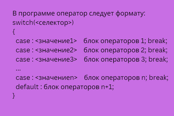 Этот оператор называется оператором множественного выбора. В языках C и C++ множественный выбор осуществляется оператором switch(<селектор>), где селектор – это переменная или выражение, чье значение анализируется оператором switch.