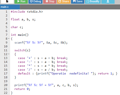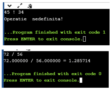 Отметим, что программа приобрела еще один функционал – если введен символ несуществующей операции, будет отображаться сообщение ” Operație nedefinită!” и программа окончит свою работу кодом завершения 1.
